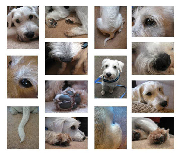Während Ihrer Abwesenheit bleibt Renate Frambach die Zeit, außergewöhnliche, detailgetreue Fotos von Ihrem Hund aufzunehmen. Diese arrangiert sie anschließend zu einer Bildkomposition. So kann ein einzigartiges Erinnerungsstück Ihres geliebten Vierbeiners entstehen. Diese Gestaltung ist ein signiertes Unikat, dessen Preis sich aus Größe und Anzahl der verwendeten Fotos ergeben würde.